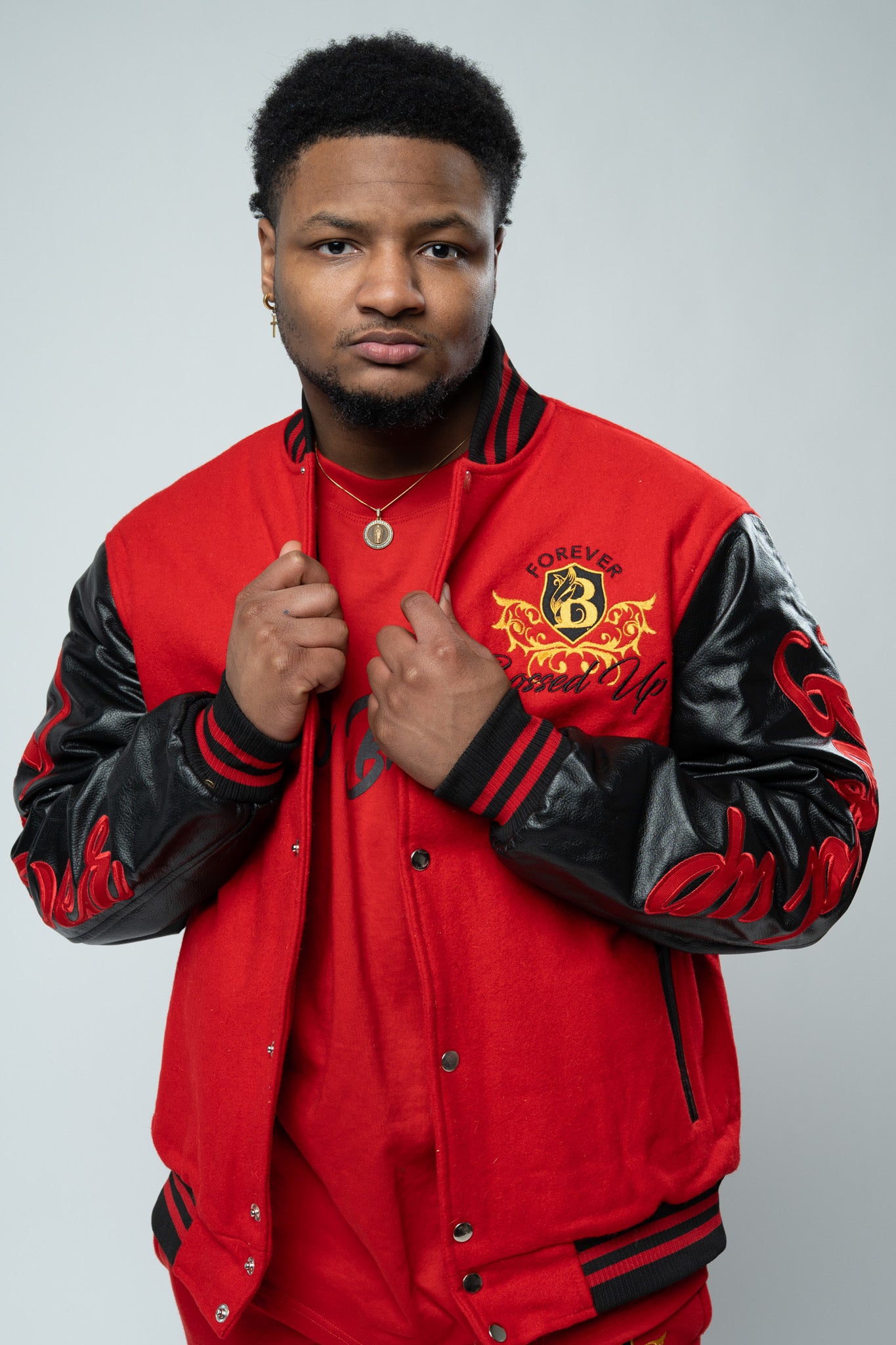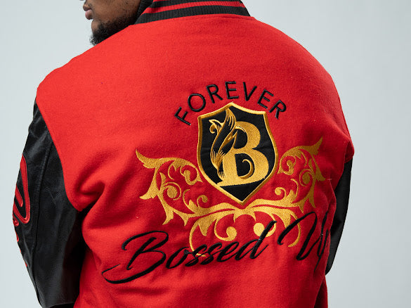 This Forever Bossed Up varsity jacket is crafted from premium wool with real cowhide leather sleeves, giving you that heavy, iconic, high-quality feel the moment you put it on. The bold red body and black leather contrast set the tone, while the oversized embroidered crest on the chest and back turns every entrance into a statement.